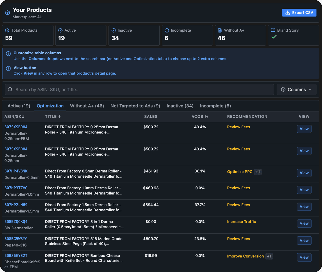 Manage listing optimization, Amazon PPC optimization, reimbursements, and profitability from a single dashboard with real-time tracking.